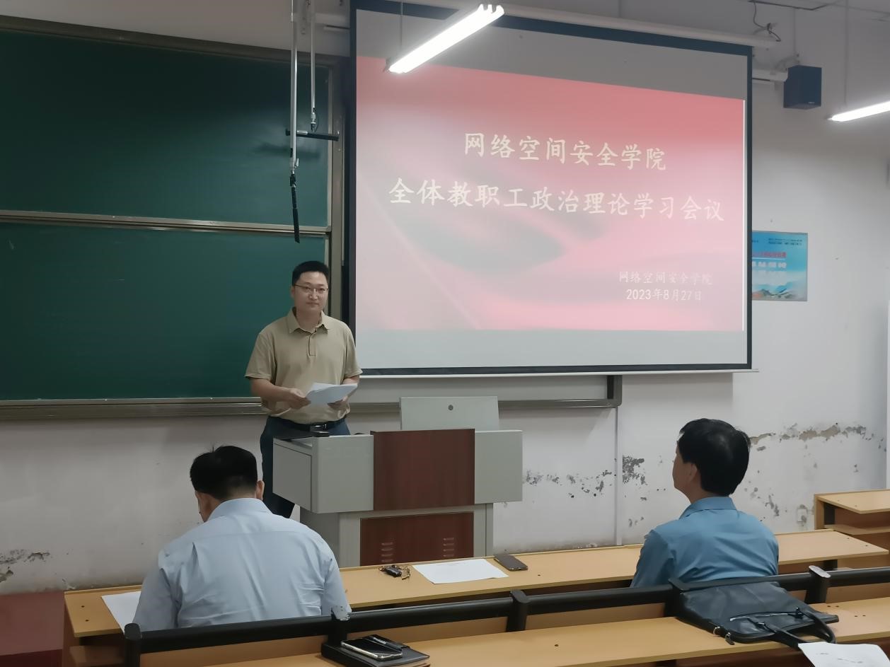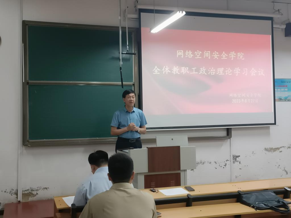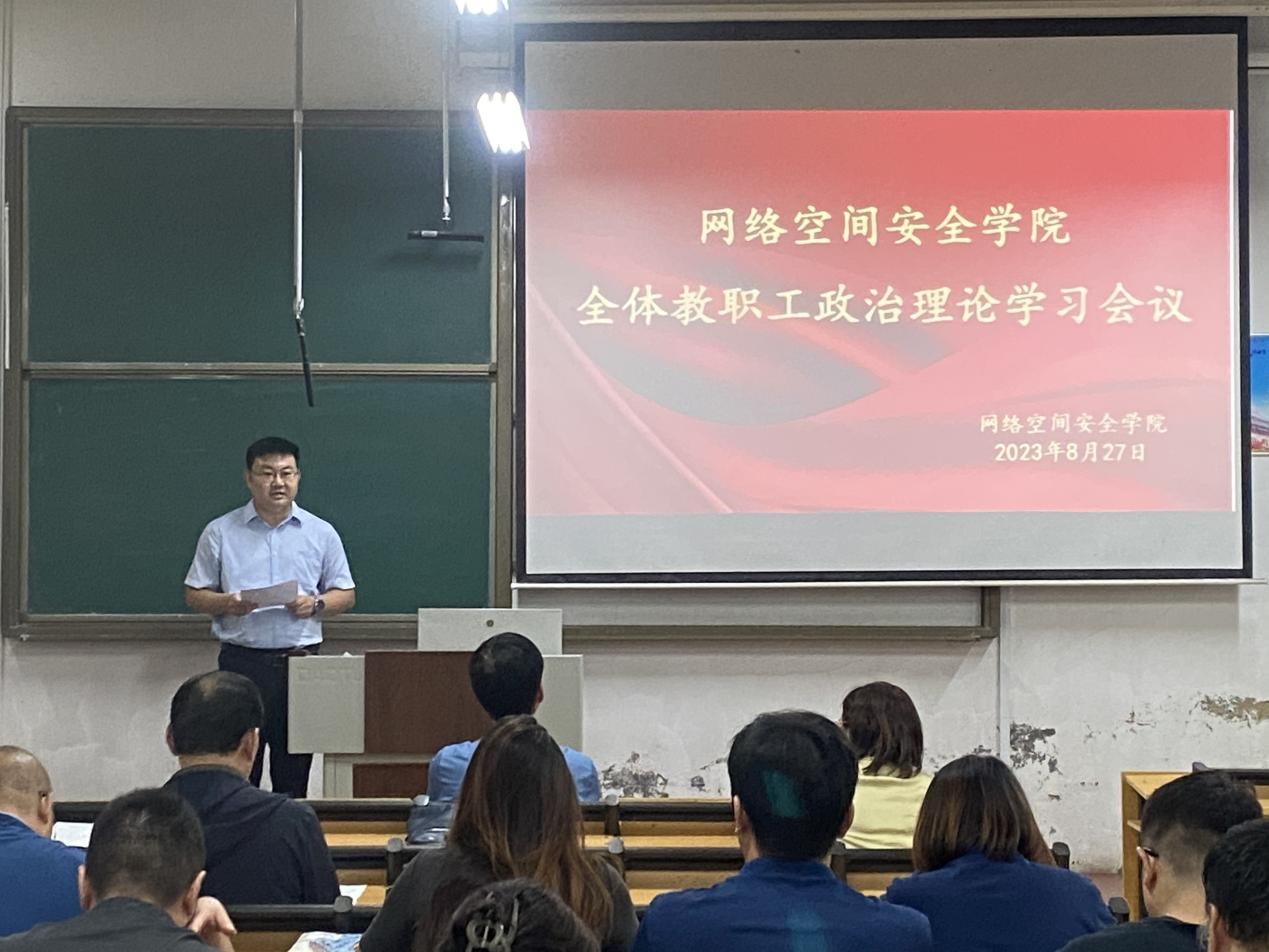 田云飞作总结讲话,他强调,新学期新气象,我们全体教职工要统一思想、统一意志、统一行动,以习近平新时代中国特色社会主义思想为指导,齐心协力、埋头苦干、追求卓越,加强师德师风建设,在学科发展和科研工作上、人才培养质量上、师资队伍建设上不断攀升,锚定高质量发展,交出一份网安学院的亮眼成绩单。