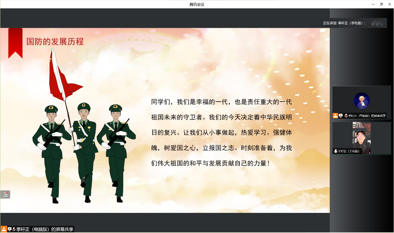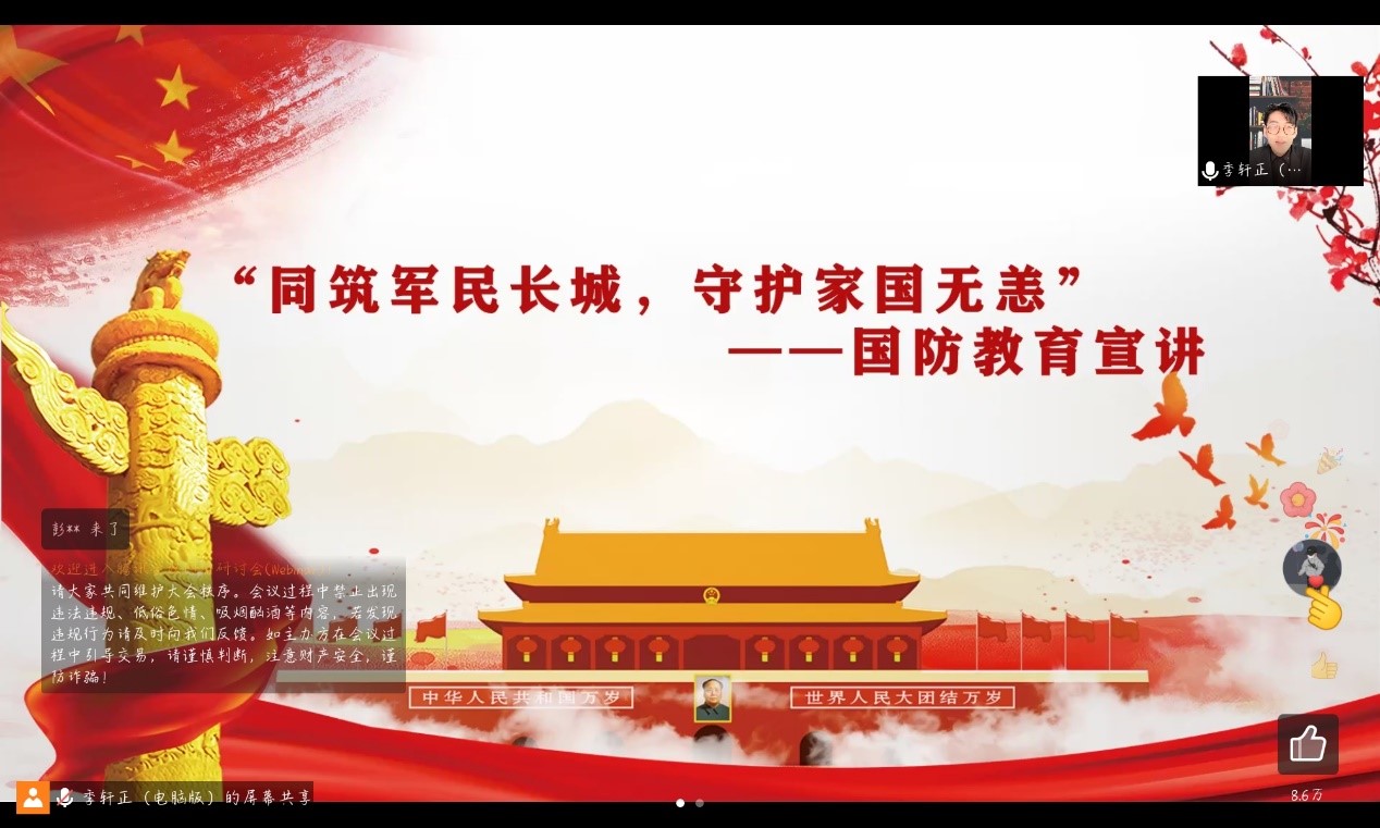 此次线上会议的召开,让同学们初步认识到当今国际形势,增强了对国家安全的重视,牢记历史,以奋发昂扬的姿态满怀步入大学的学习生活,把满腔爱国热情化作振兴中华的实际行动,对于提高学生的综合素质、深植学生爱国主义精神、增强我国国防精神力量有着重要意义。