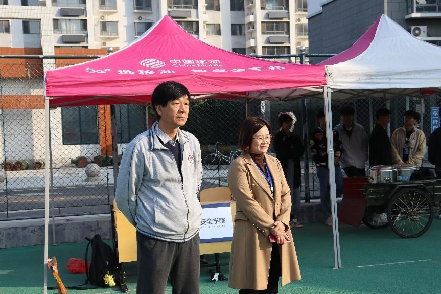 党委书记田云飞、党委副书记范瑞红、团委书记丁允念和辅导员相青到达现场指导军训工作。