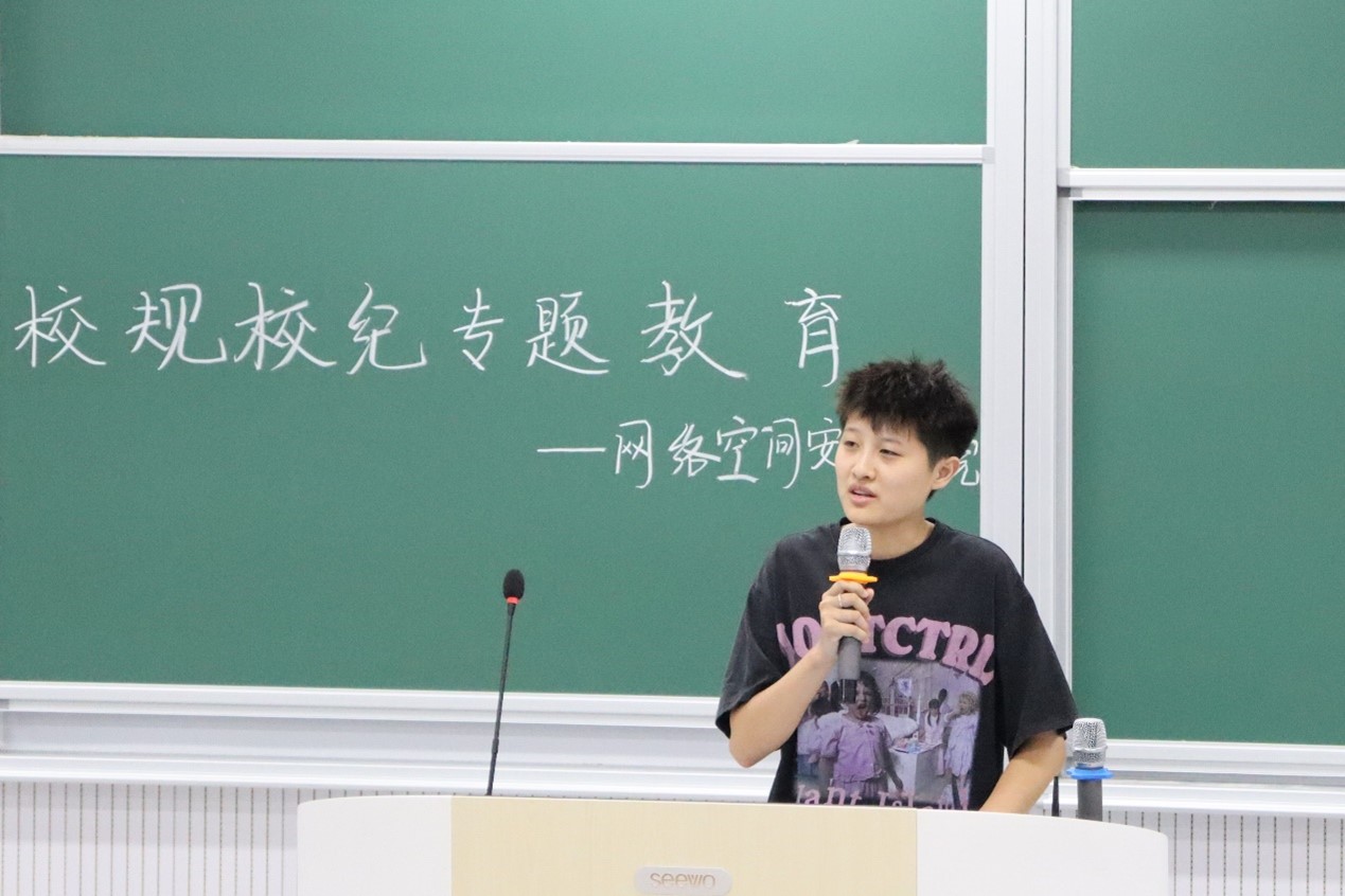 校规校纪解读学习专题教育活动于致知楼B109、B111教室进行。学院辅导员洪亚玲、赵兴卯出席活动,团委学生会主席何李阳担任主讲,2023级全体新生参加。