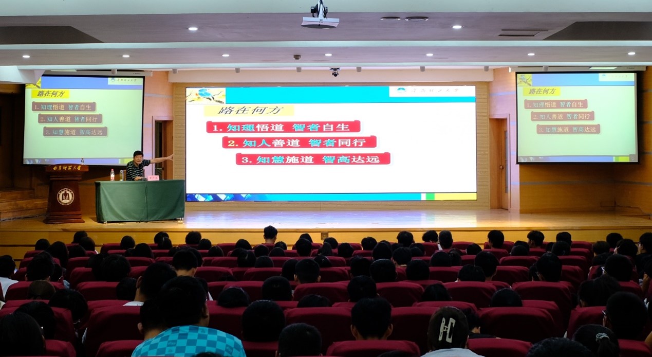 讲座以“智慧与超越——大学生的心灵成长与健康发展”为主题。讲座伊始,宋广文教授从“知理悟道”的内涵出发,以心理学视角切入,用风趣幽默的语言,从“知理悟道”、“知人善道”、“知慧施道”三个方面详细介绍了走向心灵成熟的方法,深入探讨了大学生在成长过程中会面临的压力和挑战,帮助同学们分析了当下的心理困惑,分析了未来学习生活可能遇到的问题,引导学生摆脱僵局和困惑,提高自我认知和自我调节能力。