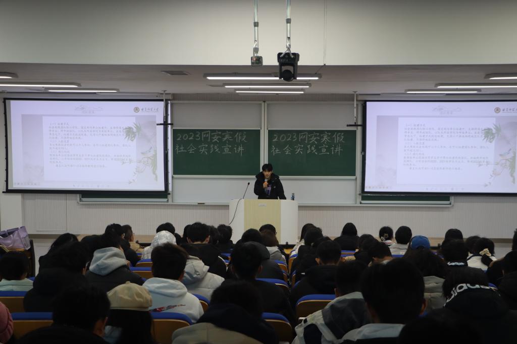 寒假社会实践宣讲活动于致知楼B102教室召开。就业实践部部长陈卓然,副部李芳威、赵善南、刘睿霖担任主讲人,2023级全体学生参与会议。