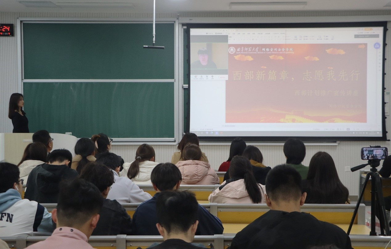 会议伊始,丁允念带领同学们观看了西部计划志愿者真实的工作和生活视频,学生们通过视频对志愿者在西部地区的工作场景、生活环境以及与当地居民的互动情况进行初步的了解。接着,学院邀请了西部计划的志愿者2023届毕业生张鸿宇通过线上的方式进行了西部计划宣讲,他讲述了自己在西部地区的志愿经历和切身的感受,并向学生们分享了自身的工作环境、生活体验、所面临的困难以及从西部计划中得到的收获。随后,丁允念为大家解读了西部计划的相关政策以及要求,鼓励更多有志青年奔赴西部,投身基层,把梦想扎根在祖国和人民最需要的地方。最后,范瑞红鼓励学生们积极参与西部计划,充盈个人成长经历,为以后的就业获取优势。