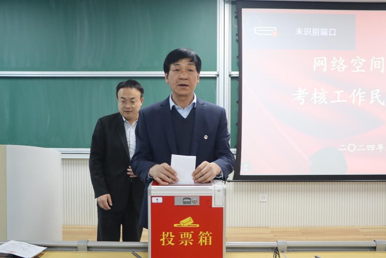 首先,田云飞对学校有关通知、学院领导干部及领导班子考核工作方案作简要说明,介绍了考核的范围、方式、流程、标准及要求等内容。随后,田云飞代表学院领导班子做了2023年工作总结,客观评价了学院领导班子运行情况和综合表现,分析了存在的问题和不足,并就进一步推动学院高质量发展提出新的工作思路。最后,学院全体教职工秉承客观公正、实事求是的原则,对田云飞、王茂励、范瑞红、马旭四位领导干部的履职情况进行民主测评。