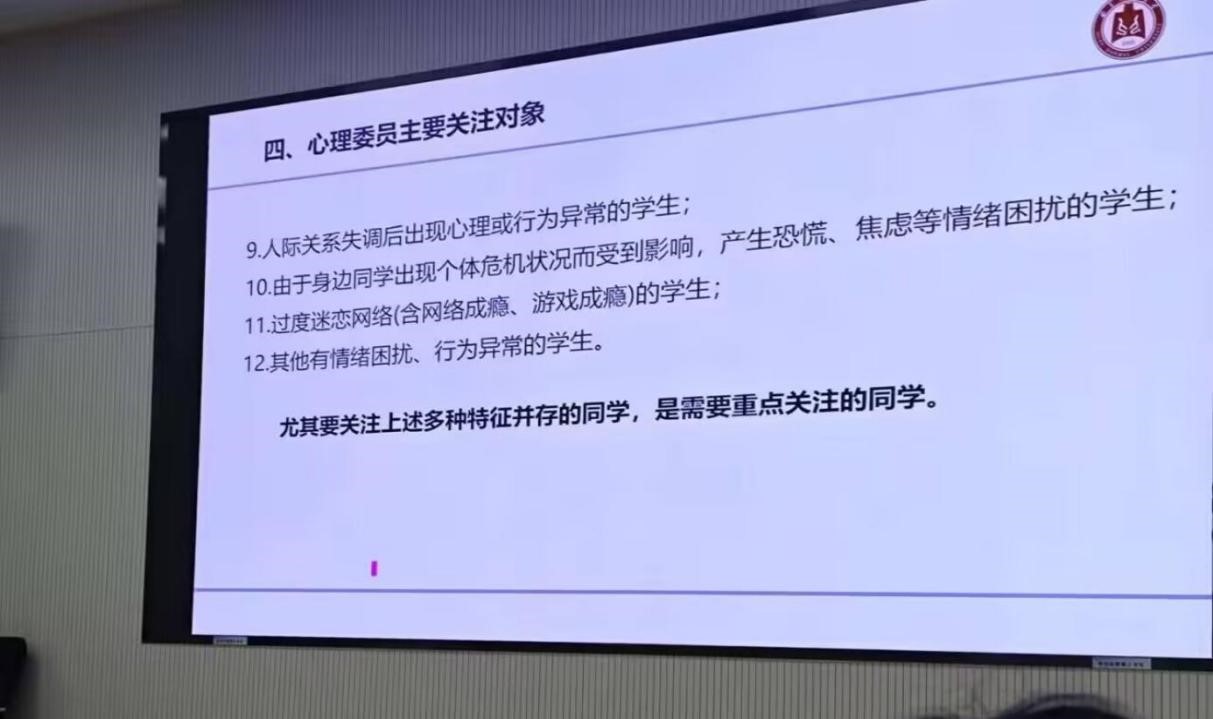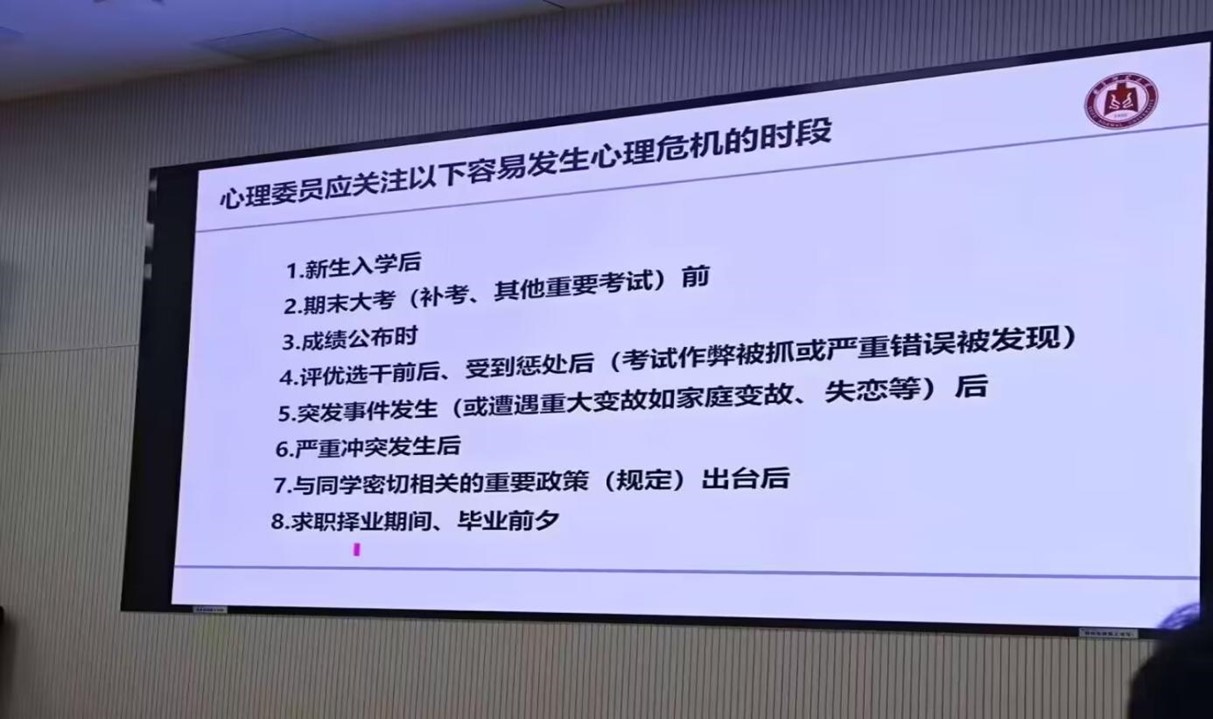 颜寅龙的培训核心在于心理危机的预防与干预,他着重阐述了这一工作的重要性,指出心理委员需通过教育普及提升意识,实施早期识别,并采取及时干预措施,以降低学生的心理危机风险。同时,他强调开放沟通、情感支持及关怀的重要性,为同学提供切实有效的帮助。