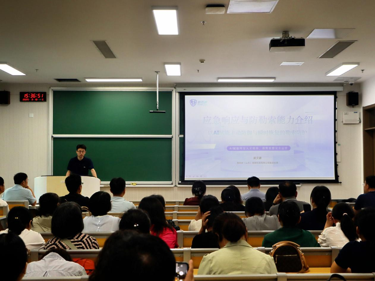 会上,梁文豪围绕“以AI赋能主动防御与瞬时恢复的勒索防护”作专题讲解。他深入剖析了当前勒索病毒的典型特征与发展趋势,分享了企业在应急响应与全周期安全防护方面的实践经验与战略方案,为参会辅导员拓宽了网络安全防护的专业视野。最后,马旭强调,辅导员要主动了解网络安全前沿技术发展动态,持续提升自身网络安全意识和信息化管理水平,将先进理念融入日常学生教育引导中,帮助学生树立正确的网络价值观和安全意识,增强学生理论联系实际、应对复杂网络安全问题的能力,共同营造安全、清朗的校园网络环境。
