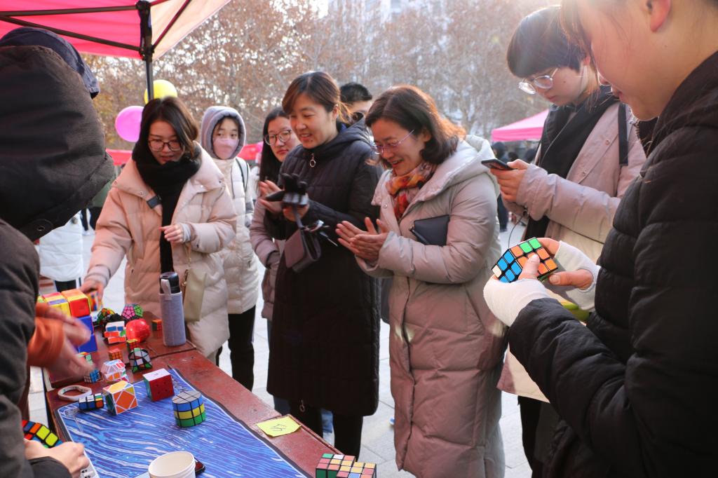剪纸协会用“一把剪刀一页红纸一双手”刻画了一件件精致且极具灵魂魅力的艺术品;魔方爱好者协会的现场魔方技巧演示和拼图效果使人慨叹其奇;航拍协会通过带领同学们观看航拍学校景象的视频和现场操作无人机的方式尽显航拍之美;桌游爱好者协会那撩动心弦的紧张刺激,吸引了每一位参观同学们的踊跃参与。不单是视觉的冲击,由大学生艺术团带来的歌曲表演更是引爆了全场。