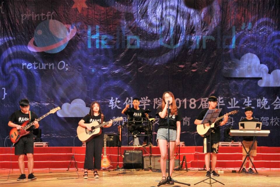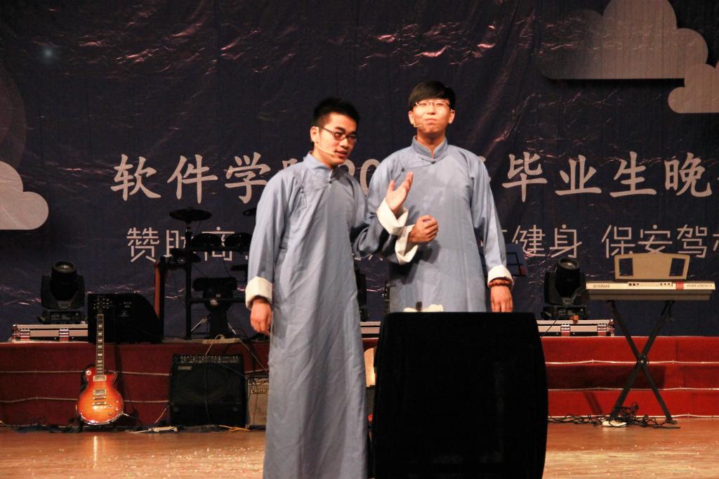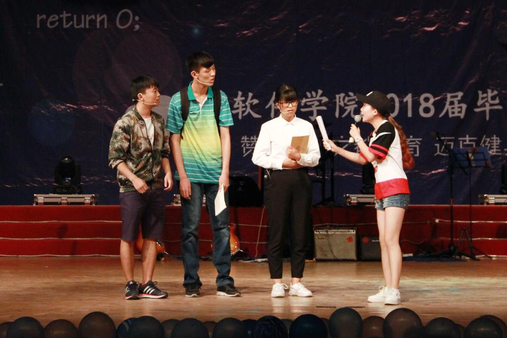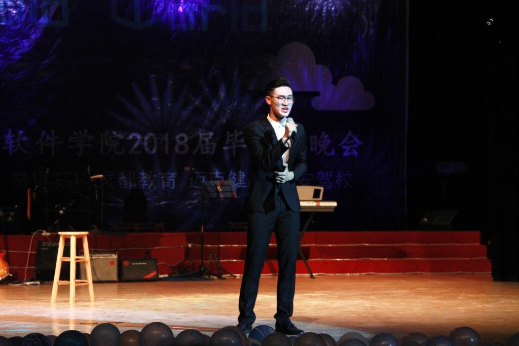 本次晚会分“人生二叉树”、“大学哈希表”、“情感溢出栈”、“青春有向图”四个具有软件文化的章节向母校告别。“遗忘中不舍、醉醒中交错、青春大概如你所说”,张志诚同学深情演唱《青春大概》,唱出了2014级学子那珍贵美好的青春。刘孝迎一曲空灵悠扬的民谣《贝加尔湖畔》将聆听者带入贝加尔湖畔的美景,仿佛置身于其中的浪漫故事。2014级刘一正、2015级张新宇同学合力出演相声《我的师哥刘一正》,幽默风趣的表演中道出了老学长对师弟师妹们的不舍与嘱托。