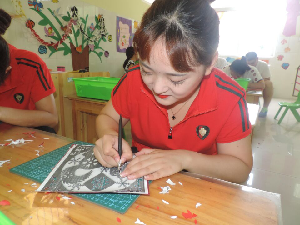 虽酷暑热、夏阳盛,但是丝毫没有消减志愿者们实践的热情和老师们学习的乐趣,志愿者利用五天的宝贵时间为幼儿园老师详细讲解培训了剪窗花、蛋袋编织、刻纸、纸雕等优秀传统民间艺术。培训期间,志愿者们由浅入深,首先介绍了剪纸这一悠久的民间艺术的起源和发展历史,随后结合课件从剪纸工具、纹样、剪法、详细步骤等方面进行了系统性地讲解和示范,老师们用手中一张张薄薄的纸片,通过叠、剪、刻等手法,将纸片幻化出千姿百态的美丽图案,展示出了剪纸艺术的独特魅力。