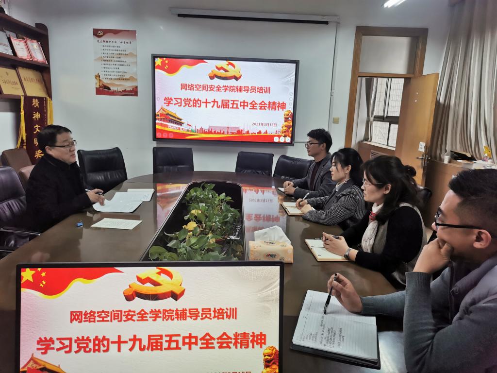 全体辅导员培训会议在410会议室召开,专题学习党的十九届五中全会精神,学院党委副书记田凯主持,团委书记范瑞红、辅导员洪亚玲、武玉龙、丁允念参加了培训。