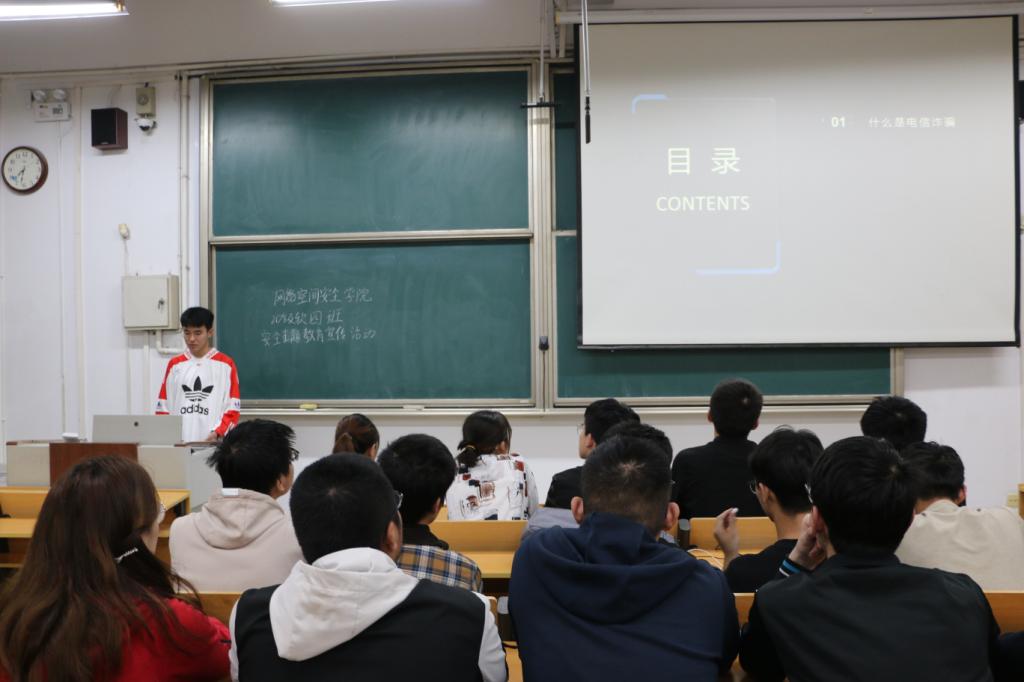 班会上,信息安全部从什么是电信诈骗、校园贷、交通安全等多个方面进行讲解,由浅入深,帮助同学们了解潜在的安全隐患,熟悉诈骗手段,学会如何防范和应对这些问题。运用典型案例对同学们进行启示引导,使宣传入耳、入脑、入心,同时也将学生的实际需求与宣传教育有机结合,进一步把安全宣传贯穿到了思想政治教育工作的具体环节中。