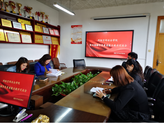 第四期辅导员素质能力提升交流会在410会议室举行,学院党委副书记范瑞红,辅导员洪亚玲、丁允念、相青、于媚媛参加学习交流。