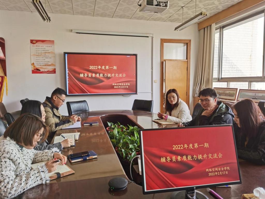 2022年度第一期辅导员素质能力提升交流会在410会议室举行,学院党委副书记范瑞红,辅导员洪亚玲、武玉龙、丁允念、相青、于媚媛参加学习交流。