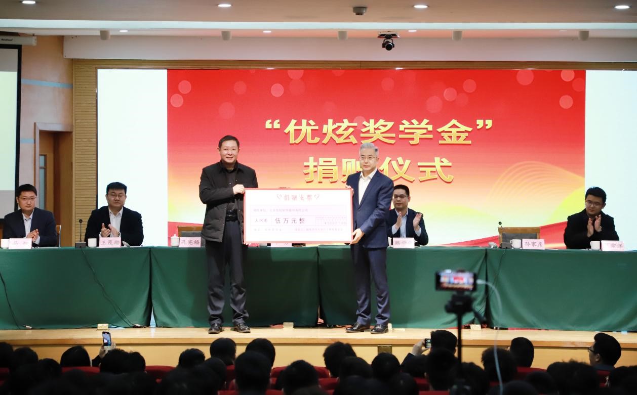 典礼上,国内合作处处长孔宪福代表学校接受北京优炫软件股份有限公司的捐赠,校企双方领导、嘉宾共同为获奖学生颁奖。此次“优炫奖学金”共5万元,分为一二三等奖,其中一等奖学金3人,二等奖学金5人,三等奖学金10人。
